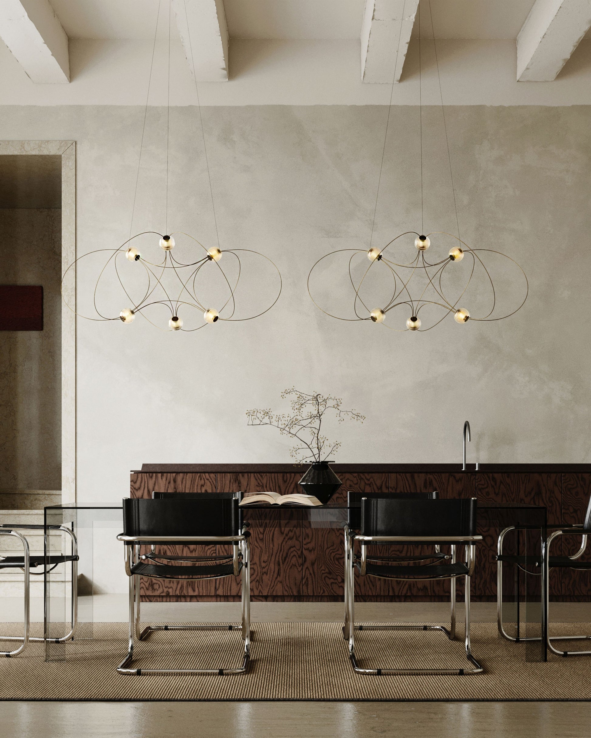 Lutz’s light fixtures create constellations that capture our attention. Some viewers see butterflies in flight, others see planets in motion, or even a scientific model. Music lovers might imagine a silent symphony led by the power of electricity.