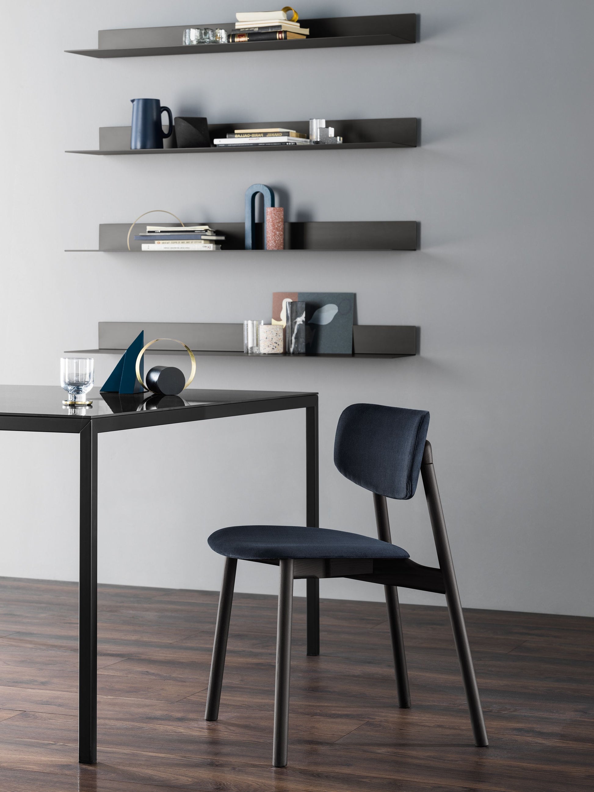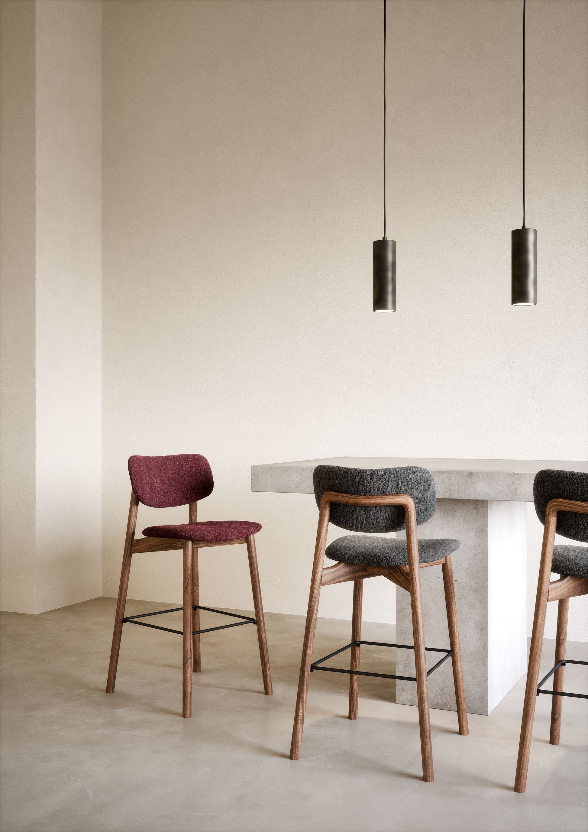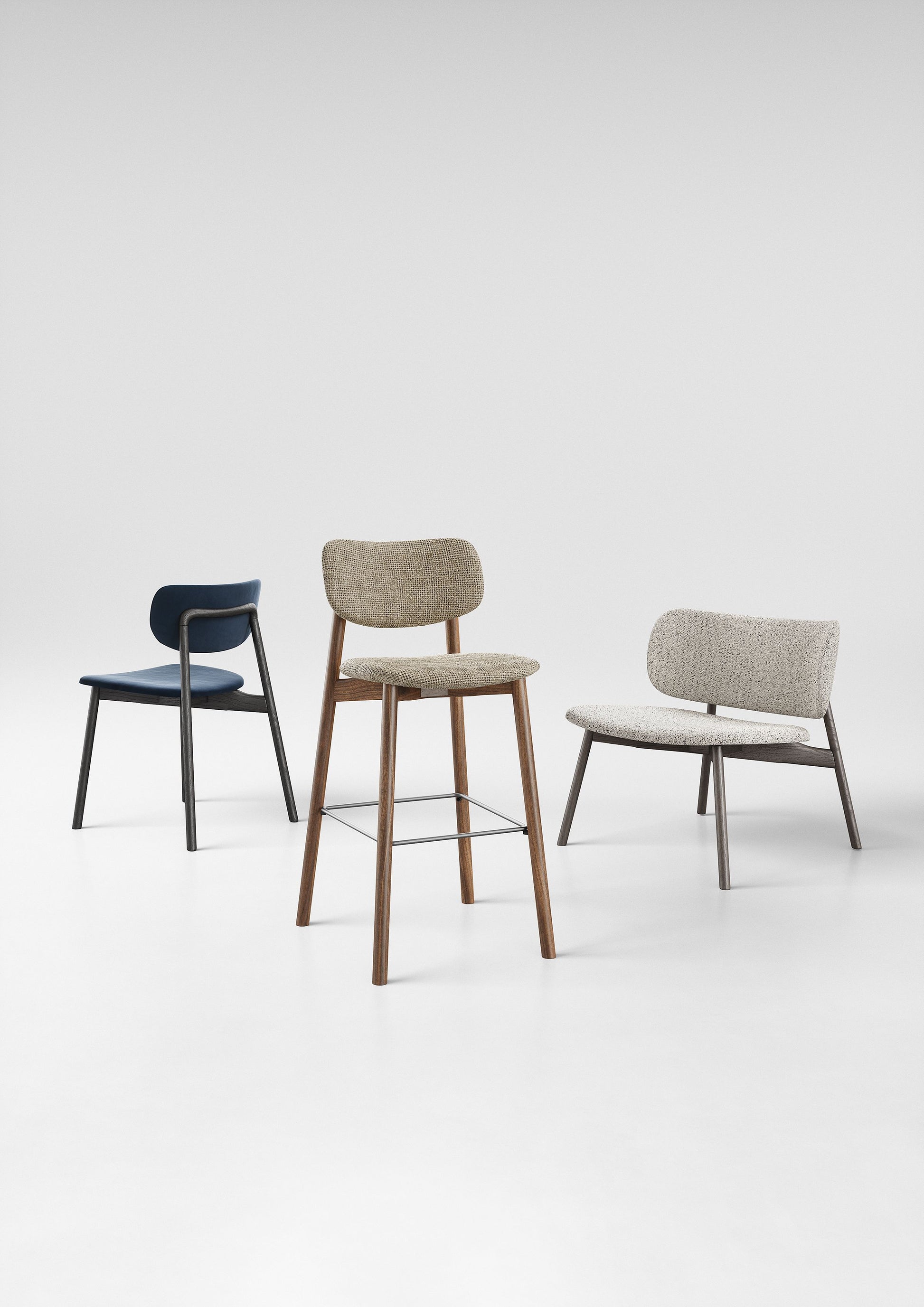 The Twist chair, designed by Matteo Zorzenoni, reinterprets 1960s-inspired shapes with a contemporary touch. Its angled wooden legs extend upward to support the backrest, creating a distinctive and dynamic silhouette. With a padded seat and backrest for comfort, the Twist is also available as a high stool and lounger chair.
