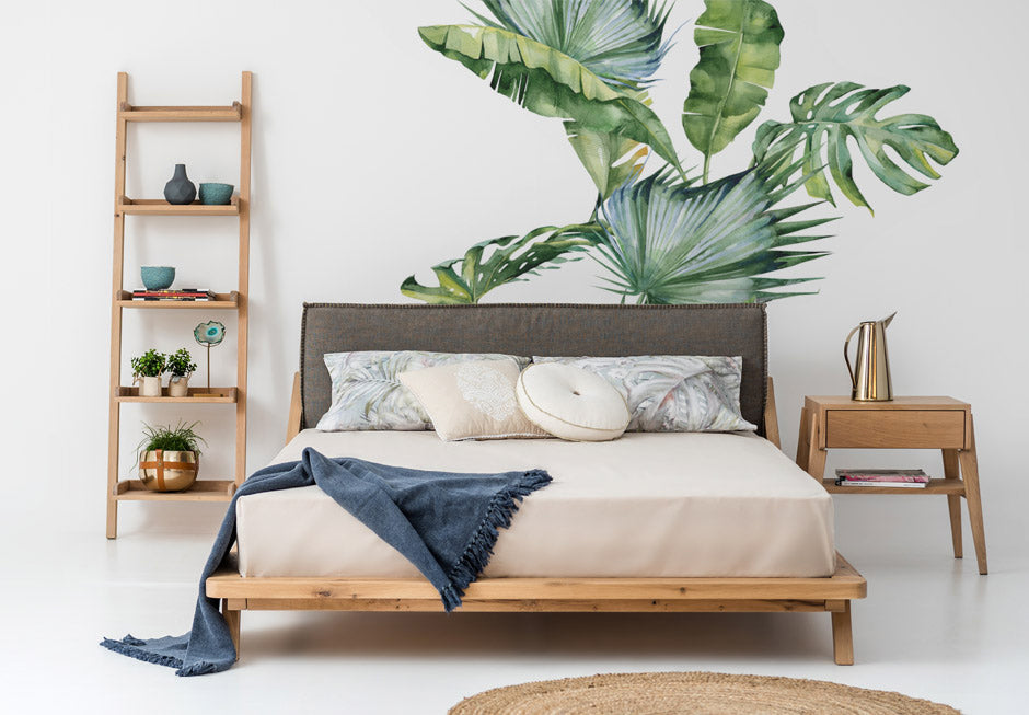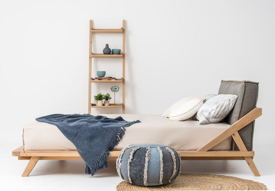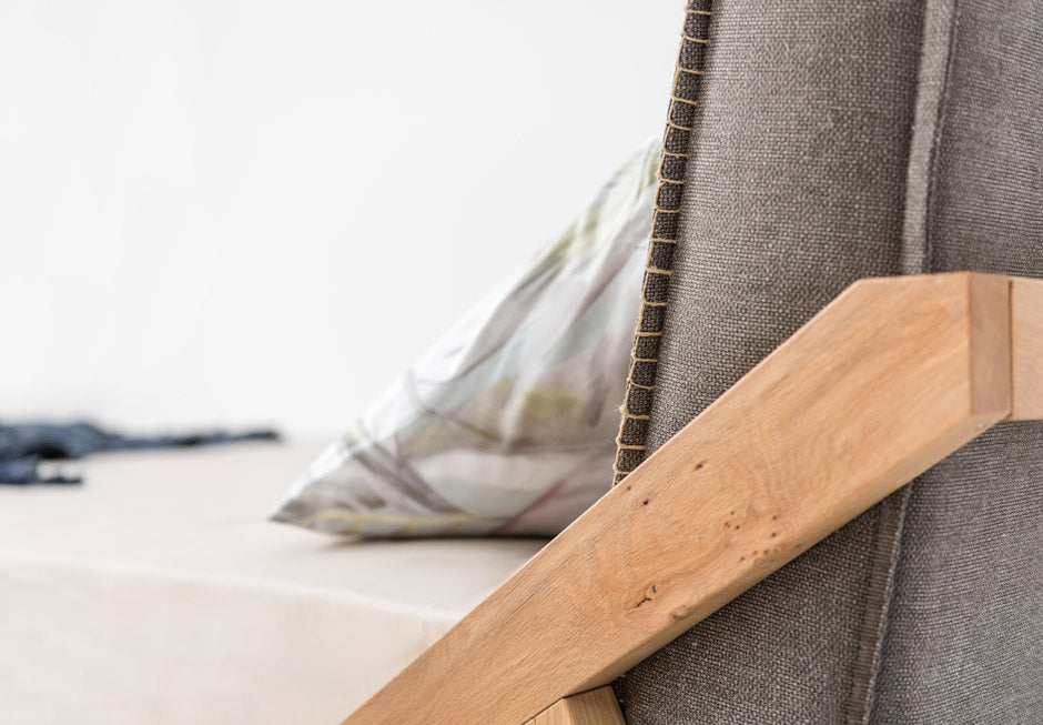 Bed met een massief eikenhouten frame en hoofdbord met afneembare bekleding, voor matrassen van 160×200 cm of 180×200 cm. Verkrijgbaar in diverse stoffen en kleuren, en op aanvraag met opbergruimte.