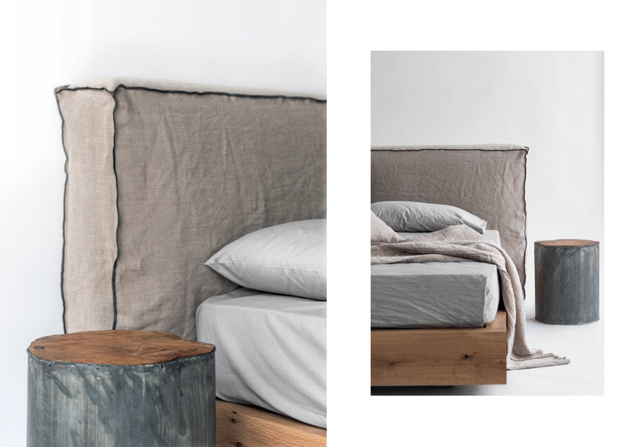 Bed met een massief eikenhouten frame en hoofdbord met afneembare bekleding, voor matrassen van 160×200 cm of 180×200 cm. Verkrijgbaar in diverse stoffen en kleuren, en op aanvraag met opbergruimte.