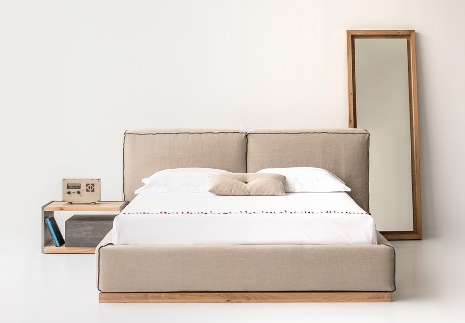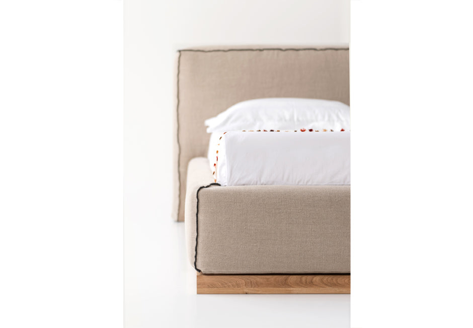 Bed met een opgemaakt onderstel met massief eikenhouten details en een hoofdbord met afneembare bekleding, geschikt voor matras 160×200 cm. Verkrijgbaar in diverse stoffen en kleuren, evenals in verschillende afmetingen, afhankelijk van het matras. Op aanvraag is er opbergruimte beschikbaar.