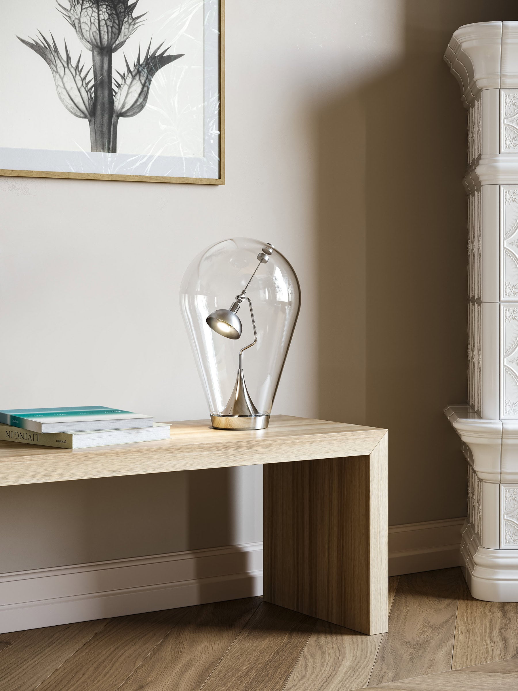 Blow is een lichte en originele design tafellamp van mondgeblazen glas. In de glazen diffuser bevindt zich een verstelbare LED-module, waarmee je eenvoudig verschillende lichtbundels kunt creëren.