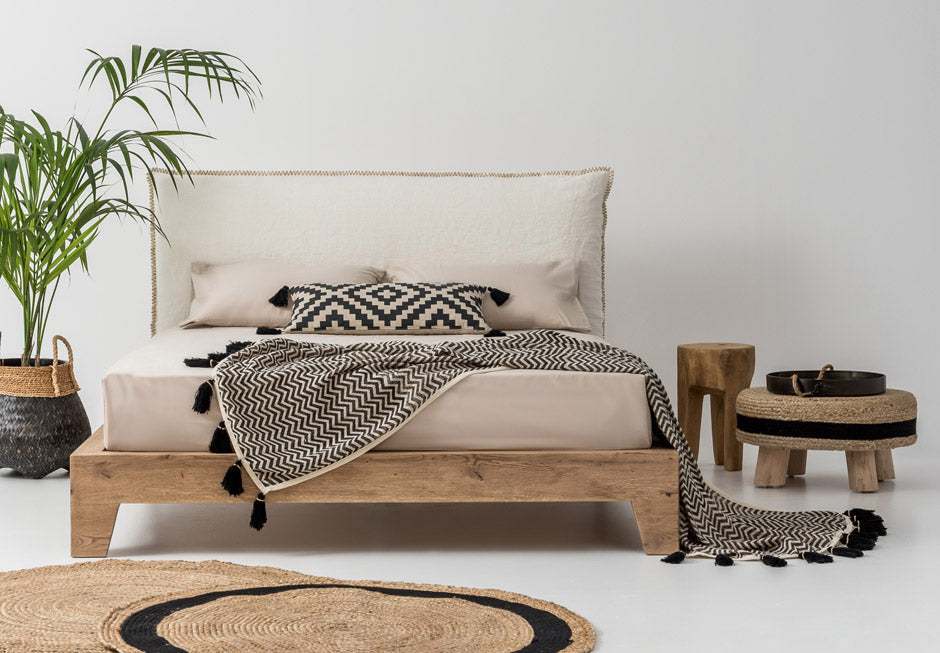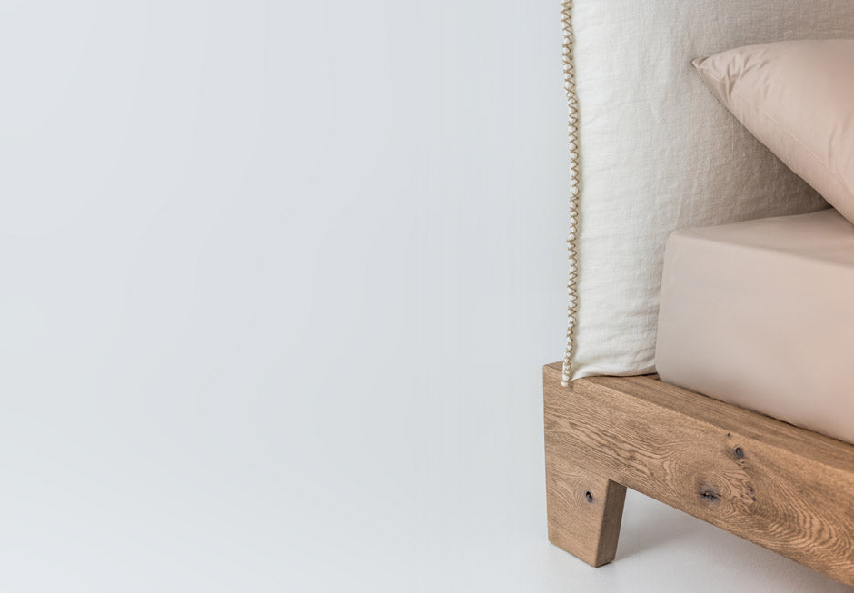 Bed met massief eikenhouten frame, geschikt voor matras 160×200 cm of 180×200 cm en hoofdbord met afneembare bekleding. Op aanvraag verkrijgbaar in diverse stoffen en kleuren.