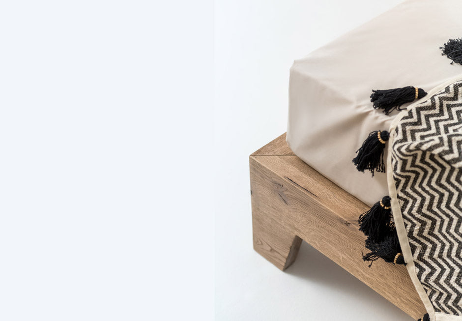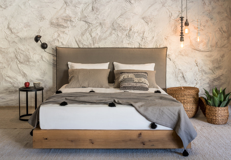 Bed met massief eikenhouten frame en hoofdbord met afneembare bekleding, geschikt voor matras 160×200 cm of 180×200 cm. Verkrijgbaar in diverse stoffen en kleuren, en op aanvraag met opbergruimte.