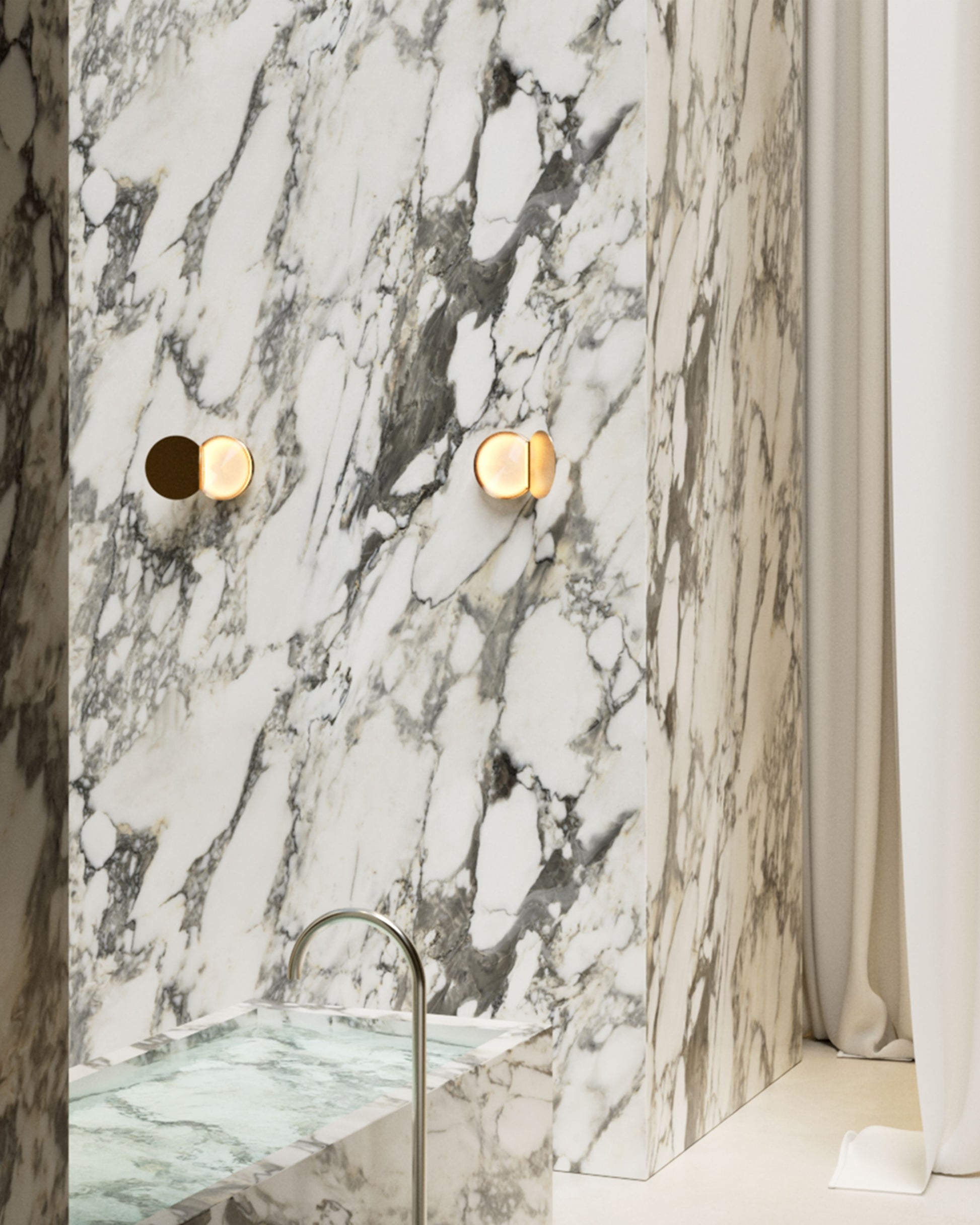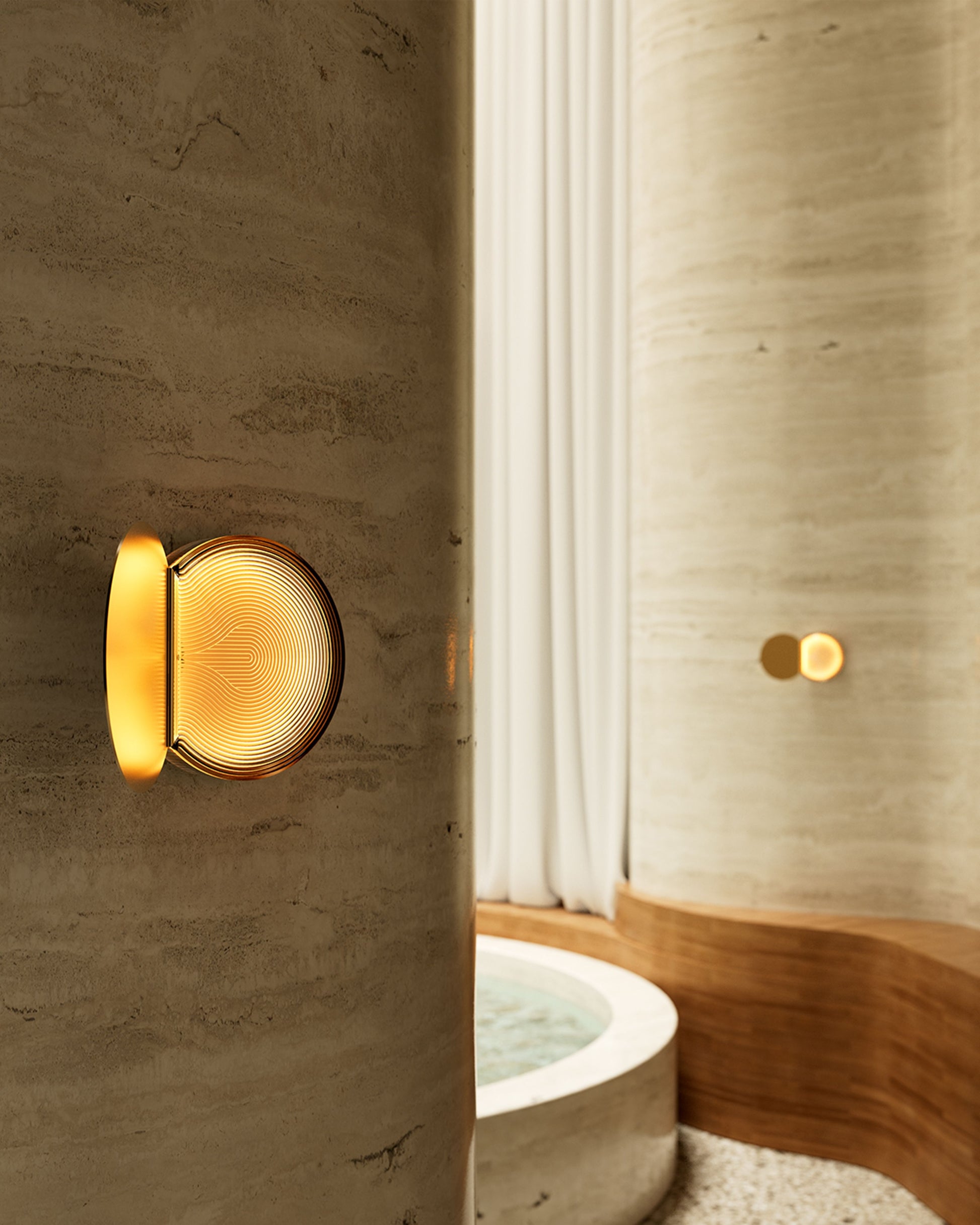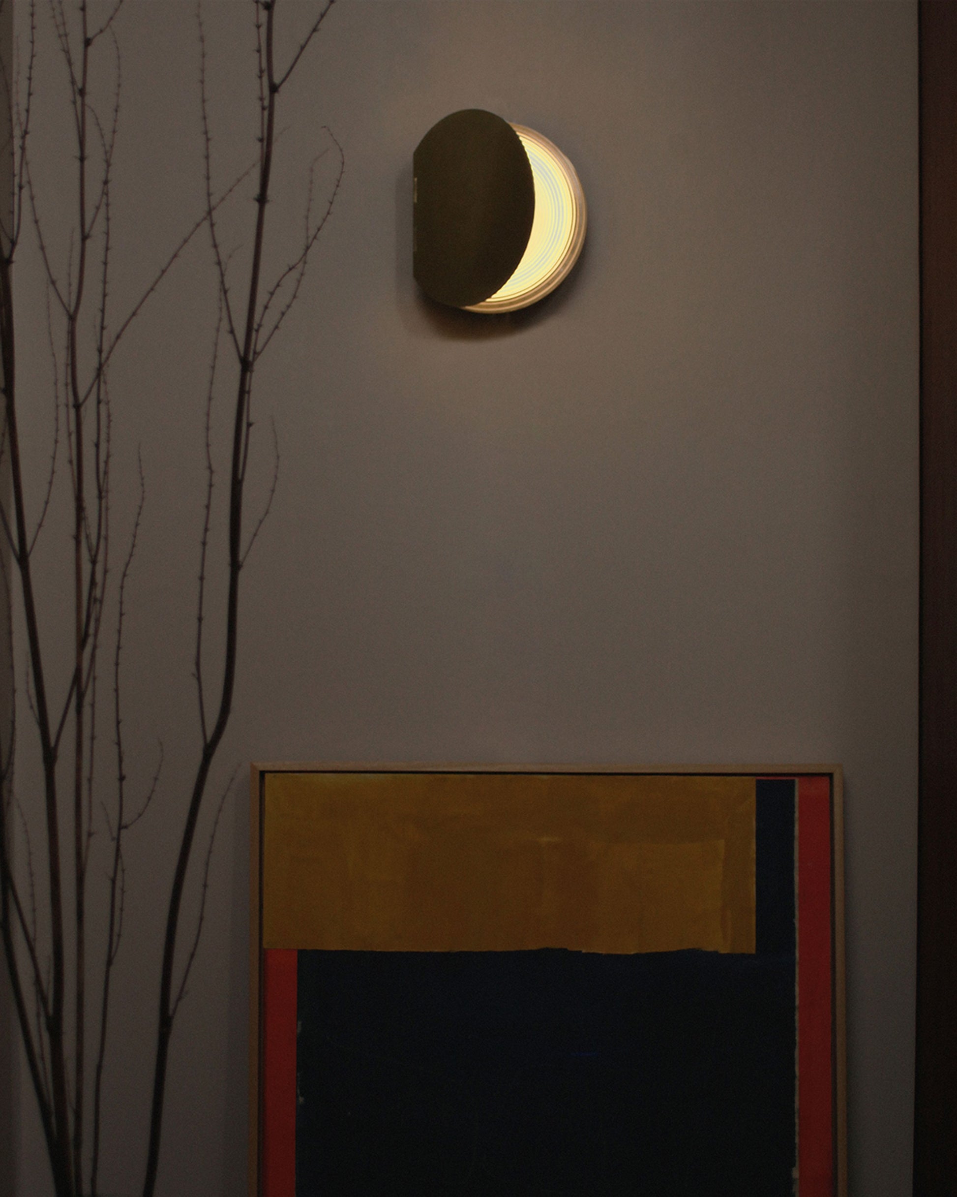 Het licht wordt zacht en gelijkmatig verspreid door een dikke glasplaat, waardoor een warme en uitnodigende sfeer ontstaat. Binnenin werkt een gepolijste messing klep als een draaibare spiegel, verbonden met een zichtbaar en mooi afgewerkt scharnier.